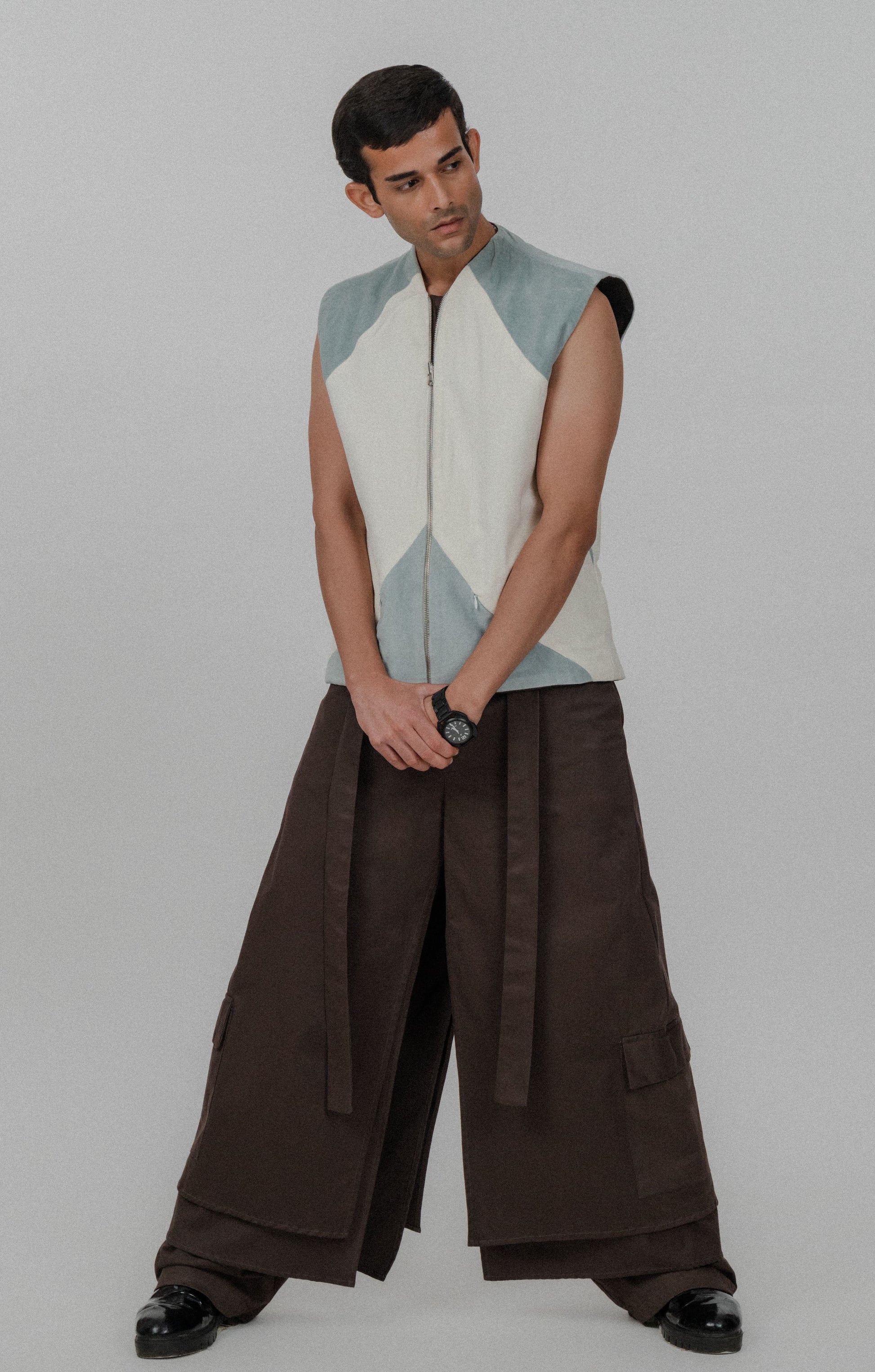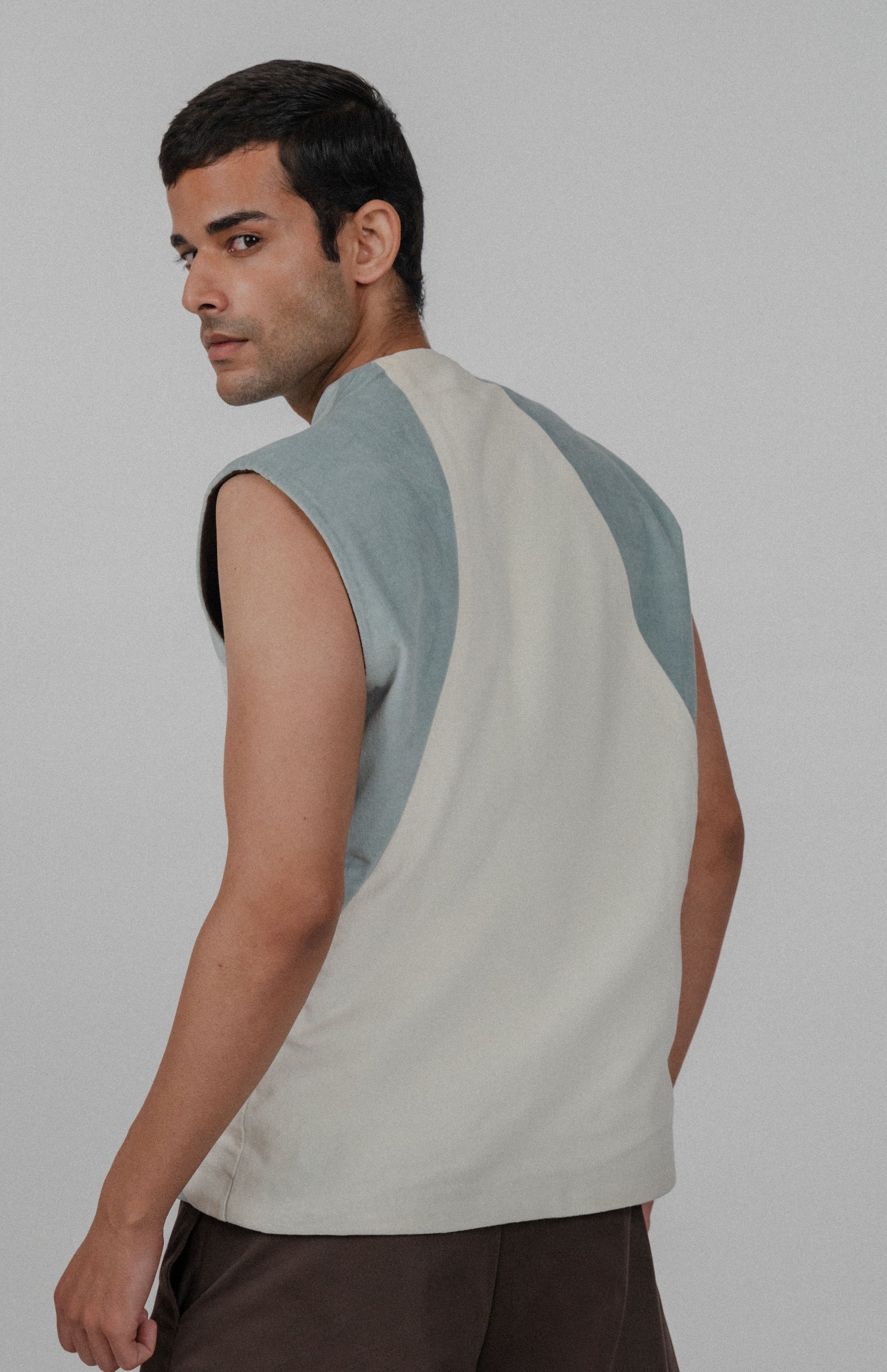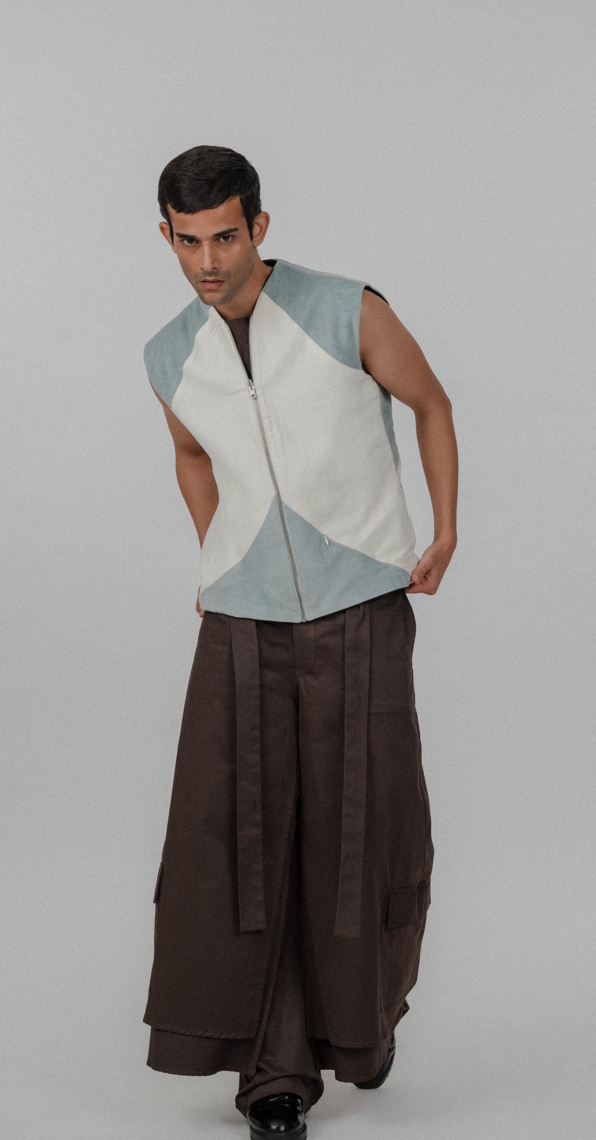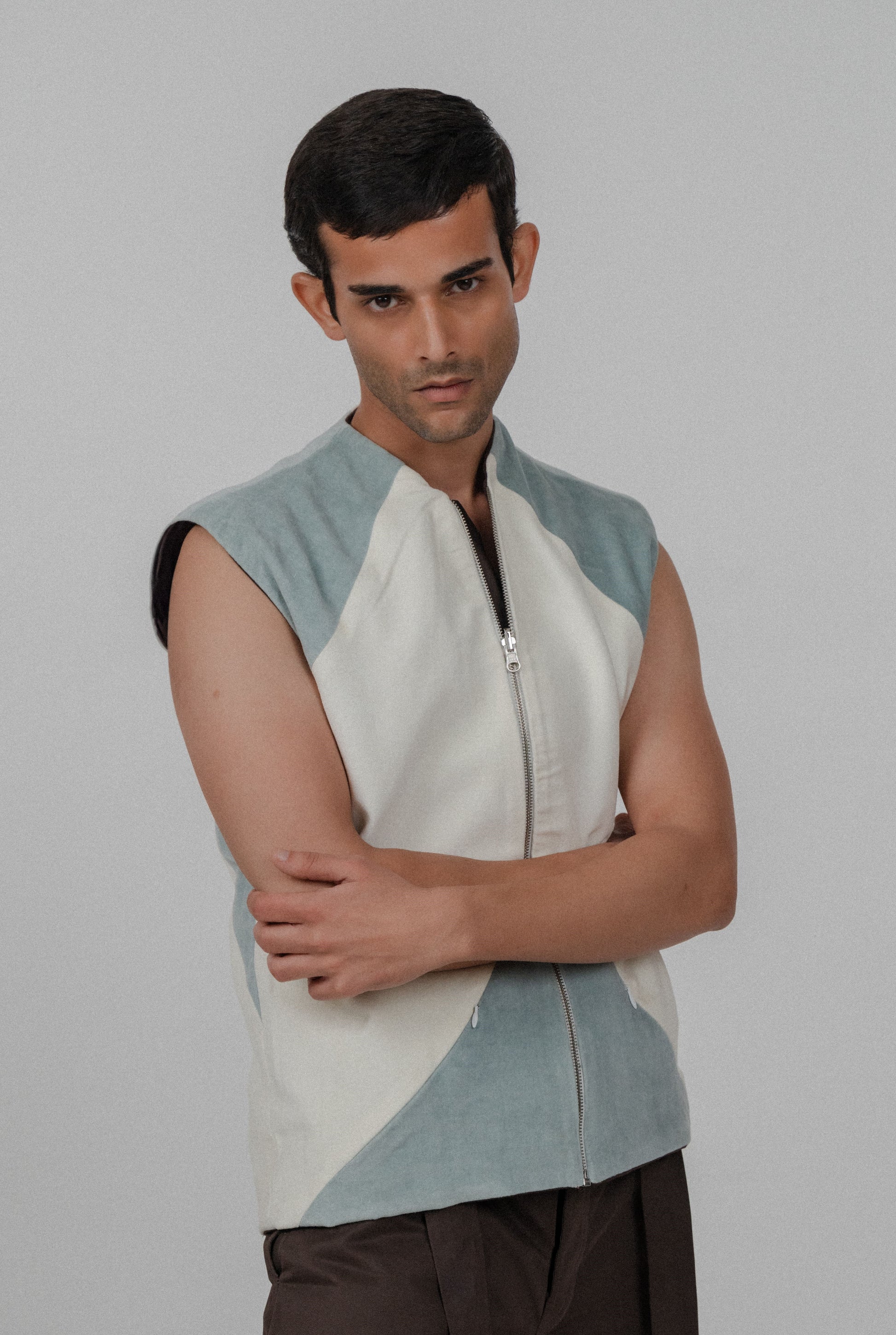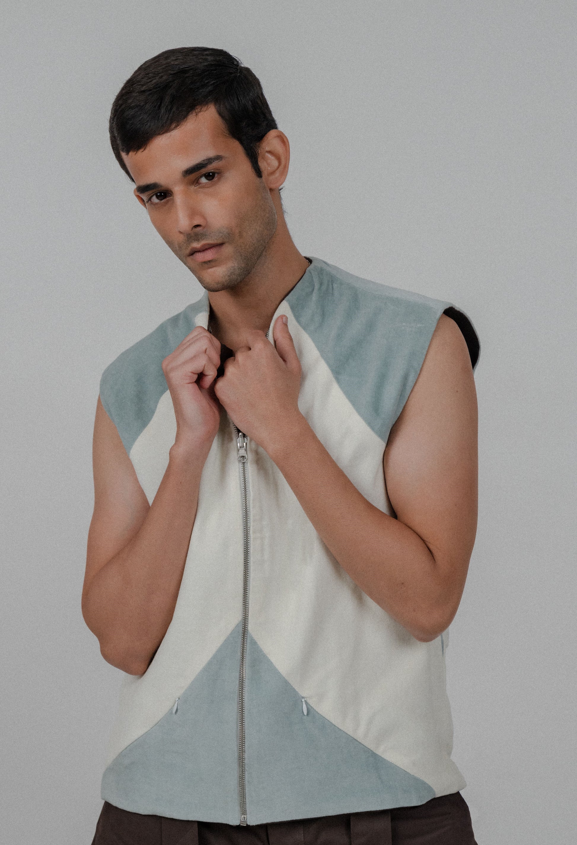 The Oasis Jacket is a sleeveless piece designed with clean lines and a contemporary silhouette. Made from soft, high-quality fabric in serene shades of blue and cream, this jacket offers a modern twist on classic styles. Featuring a front zipper and a minimalist color-blocked design, it brings a refined, understated aesthetic. Perfect for layering or wearing on its own, the Oasis Jacket adds a touch of effortless sophistication to any look.